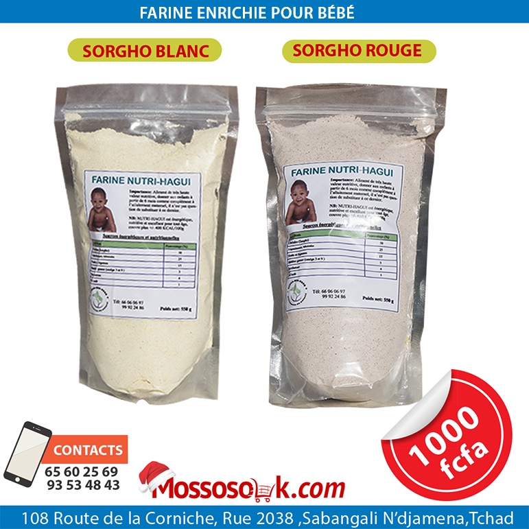La farine Nutri-Haggui est une farine enrichie pour bébé à base des Sorgho rouge et blanc fabriquée au Tchad.
