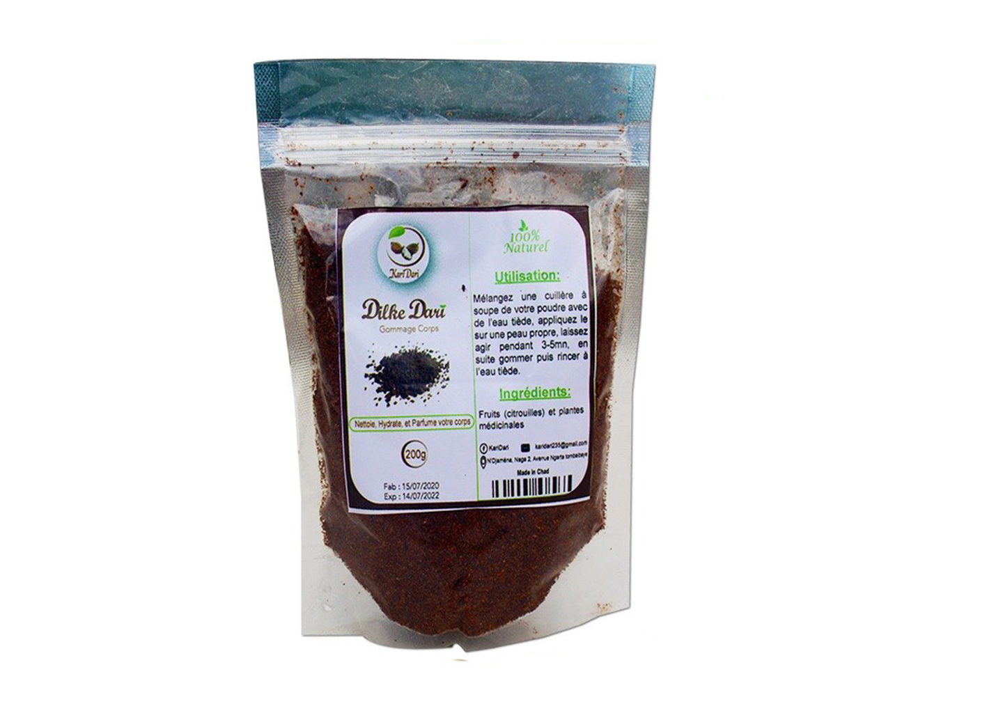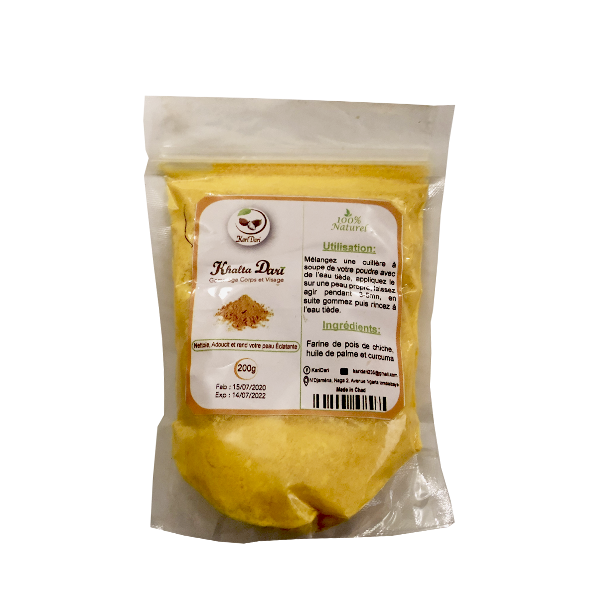 Gommage corps et visage, fait à base de la farine de poids de chiche, de l'huile de palme et du curcuma.